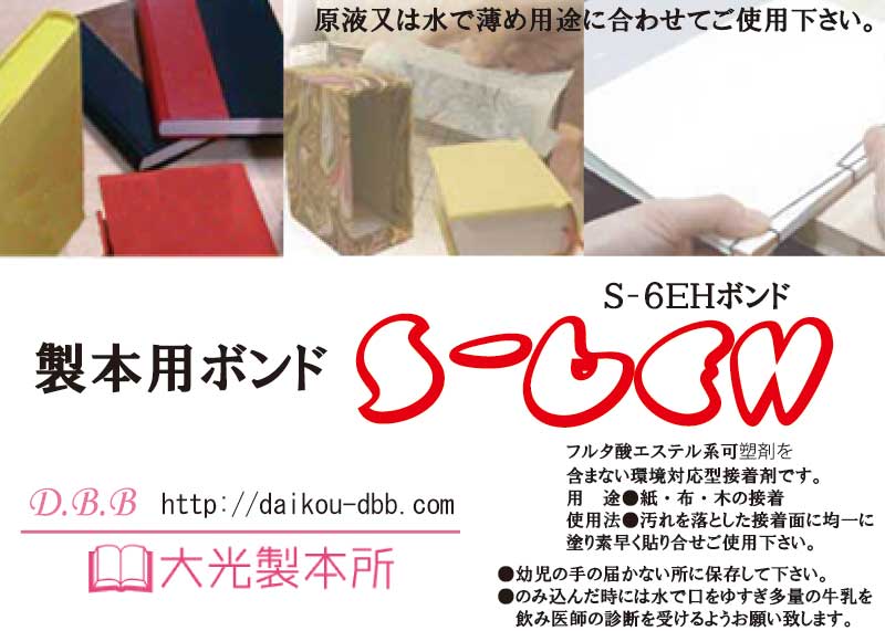 製本用ボンド【S-6】 250ml 弊社が使用している製本用ボンドです。 業務用を250mlの容器に小分けして販売しております。 製本の背固め(寒冷紗・クラフト・花布等)に使用します。 環境対応型の接着剤です。 |