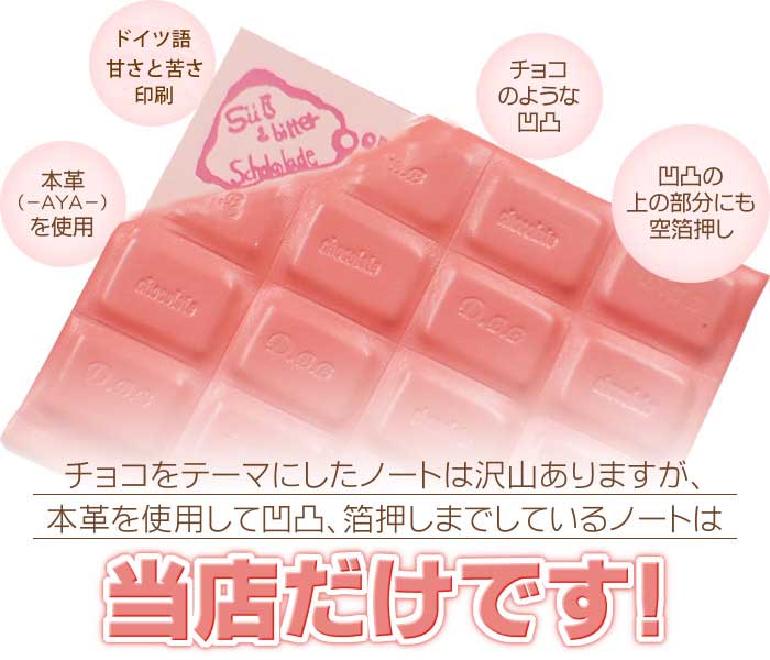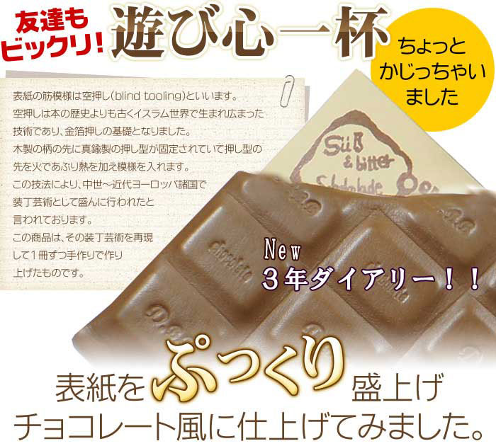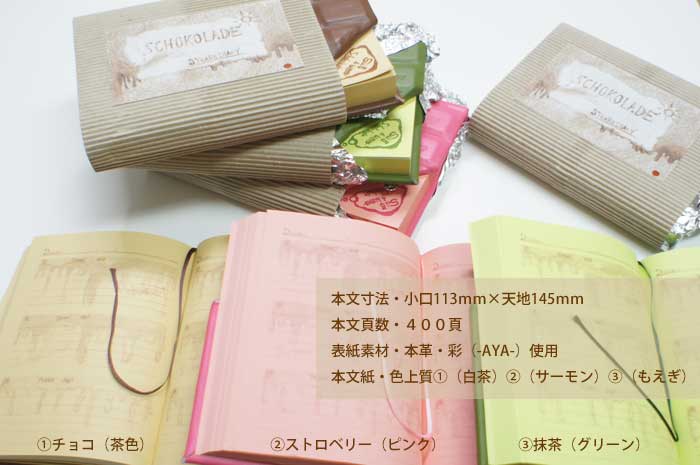 チョコ型3年ダイアリー・チョコ(茶色)・ストロベリー(ピンク)・抹茶(グリーン)の3色揃えております。